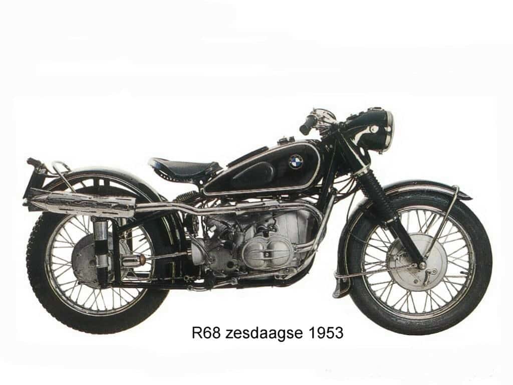 Na de nederlaag in 1945 waren de Duitsers nergens meer welkom om deel te nemen aan wedstrijden. Buiten dat lagen de fabrieken in puin en men had andere prioriteiten dan het produceren van wedstrijdmotoren. Begin jaren ‘50 werd opnieuw een opening gemaakt en mochten ze deelnemen aan internationale organisaties. De basis voor de machines was nog steeds de normale straatmachine maar door allerhande wijzigingen trachtte men het gewicht naar beneden te halen en terreineigenschappen te verbeteren. De R68 met omhoog lopende uitlaten is daar een mooi voorbeeld van. Rijden met zo’n ding in terrein moet een hele klus geweest zijn, 200 kg op de weegschaal, weinig grondspeling en vering: je moest lekker gek zijn. Wat later zou het invoeren van de Earles voorvork nog eens negatief werken op het stuurgedrag. Het is dan ook niet verwonderlijk dat men vanaf begin jaren ‘60 al deze vering had vervangen door een telescoopvork. Nu gezien was dat een eerste teken dat men bij BMW op iets aan het broeien was. Sebastian Nachtmann had zo’n vork in de 69S zitten. De motoren waren er dus al wel maar doelgericht werk vanuit de fabriek om deze modellen ook daadwerkelijk op de markt te brengen zou nog wat duren.