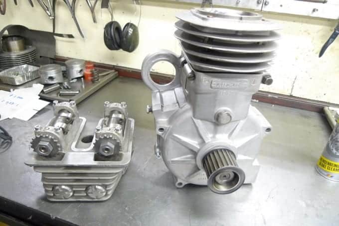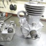 Het blok werd open gemaakt en verregaand in orde bevonden. Natuurlijk moest het een kringloopsmering in plaats van een total loss systeem krijgen. Daarvoor maakte Jan een olie retourpomp. De aanpassing van het total loss systeem hield in dat er een olie opvangbak onder het carter werd gemaakt. Vanuit die instant carterpan wordt de olie weer naar een olietank gepompt worden. Er moest ook een nieuwe zuiger in i.v.m. de compressie verlaging (was 1:14 nu 1: 11,3) De eencilinder had immers een wedstrijdverleden op alcohol. Dat was te zien aan de ingeslagen letters: ‘HS’. Henk Slachter was een gerenommeerd speedway en grasbaan tuner.