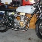 Met het idee van ‘ongeveer zoiets’ ging Jan aan het graven in de middenbokken voorraad van sloperij Woesthoff, een bedrijf dat zijn vaste klanten gewoon de vrijheid in het magazijn geeft. De gevonden bok moest natuurlijk weer veranderd worden, maat toch… Het Norton stuur was er nog een uit Jan’s voorraad en de tellerpartij heeft ooit op een Honda CB 750 F1 gezeten. De tank kwam van een Suzuki GT500. Hij moest rondom pas gemaakt worden en is tijdelijk. Want Jan wil een aluminium tank. Omdat het hele project low budget is komt een gekochte tank niet in aanmerking.