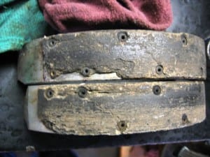 Het nu zichtbare binnenwerk is droog en stoffig of bij de anderhalve Harley of Germano klassieker met hydraulisch bediende achterrem klonterig nat. Droog stof duidt op eerlijke slijtage. Nattigheid duidt op olielekkage via een remcilinder. Wanneer de remvoering er dan ook nog eens nattig en glad uitziet, denk hierbij aan alle moois met cardan aandrijving, dan weten we in elk geval dat ze vervangen moeten worden. Of dat er nieuwe voeringen opgelijmd – of geklonken moet worden. En natuurlijk moet de olie- of remvloeistoflekkage tegelijkertijd verholpen worden. Dat komt Uralrijders bekender voor dan BMW piloten. Maar toch…