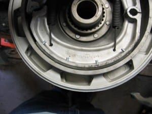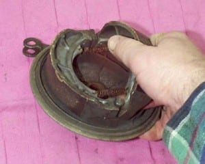 Bij thuiskomst moet zo’n trommel er dus af. Maar dan wil de demontage nog wel eens tegenzitten manneer de remschoenen in de loop van de jaren een spoor in de trommel hebben gesleten. De schoenen blijven dan haken achter het ‘dammetje’ dat ze gemaakt hebben tussen hun aangrijppunt en de buitenrand van de trommel. Draai lekker veel speling in de remkabel of –stang. Rol de motor dan met onderbreken inknijpen-trappen van de rem even heen en weer. Daardoor ‘lopen de remschoenen af’ naar hun laagste punt in de trommel.. Kijk na het verwijderen van de trommel direct even of die aan de binnenzijde niet beschadigd is. Een remtrommel kan scheurtjes vertonen of groeven in het remoppervlak hebben. Let daar vooral bij op wanneer je op een beurs tegen de Fontana van je dromen aan loopt.