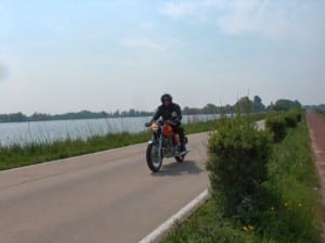 De motor heeft een aantal herkenningspunten zoals een niet originele snelheidsmeter waarbij de het logo op de beige/gouden wijzerplaat is weggewerkt met zwarte verf. Misschien beter herkenbaar zijn de oranje verfspatten op de spaken en oranje bougiedop. Het voorspatbord is beschadigd.