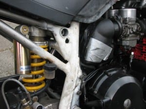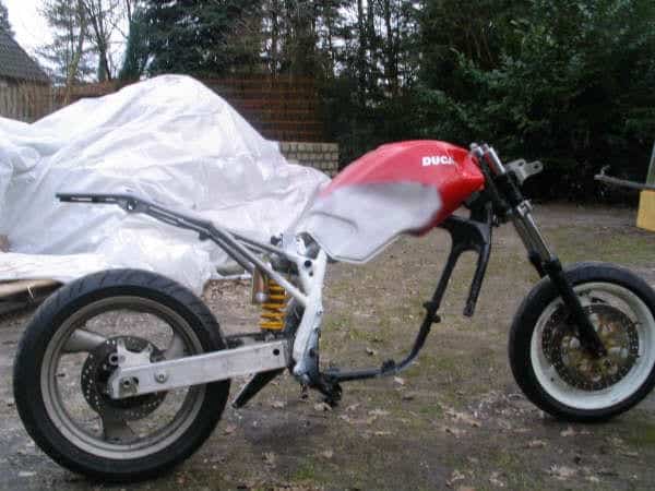De luchtfilterkast heeft wat amputaties ondergaan in verband met de frame wijzigingen. Hij lekt nog via wat kieren en spleten. Dat heeft de aandacht. De voor- en de achterkant komen van Ducati. Een stuk van de bovenkant ook. De tank is eigenhandig herstyled. De bovenste balhoofdsplaat was een stuk freeswerk dat was uitbesteed. Het is wel betaald, maar niet goed gedaan. De risers staan wat wankel. Philippe heeft intussen zelf een CNC programma gemaakt.