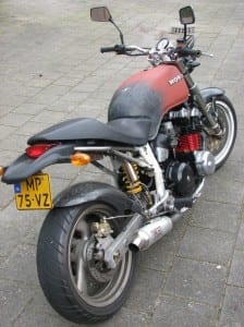 En nu kan ik er hier wel vier kantjes A4 uit gaan kloppen, maar bekijk liever de foto’s… En huiver. Phillippe maakte een absoluut unikaat voor de prijs van een winkeldochter. Oh ja, en hij wordt straks nog strak en mooi gespoten ook. Het blok is een brave CB 900 Bol ‘d Or viercilinder. Gereviseerd en wel.