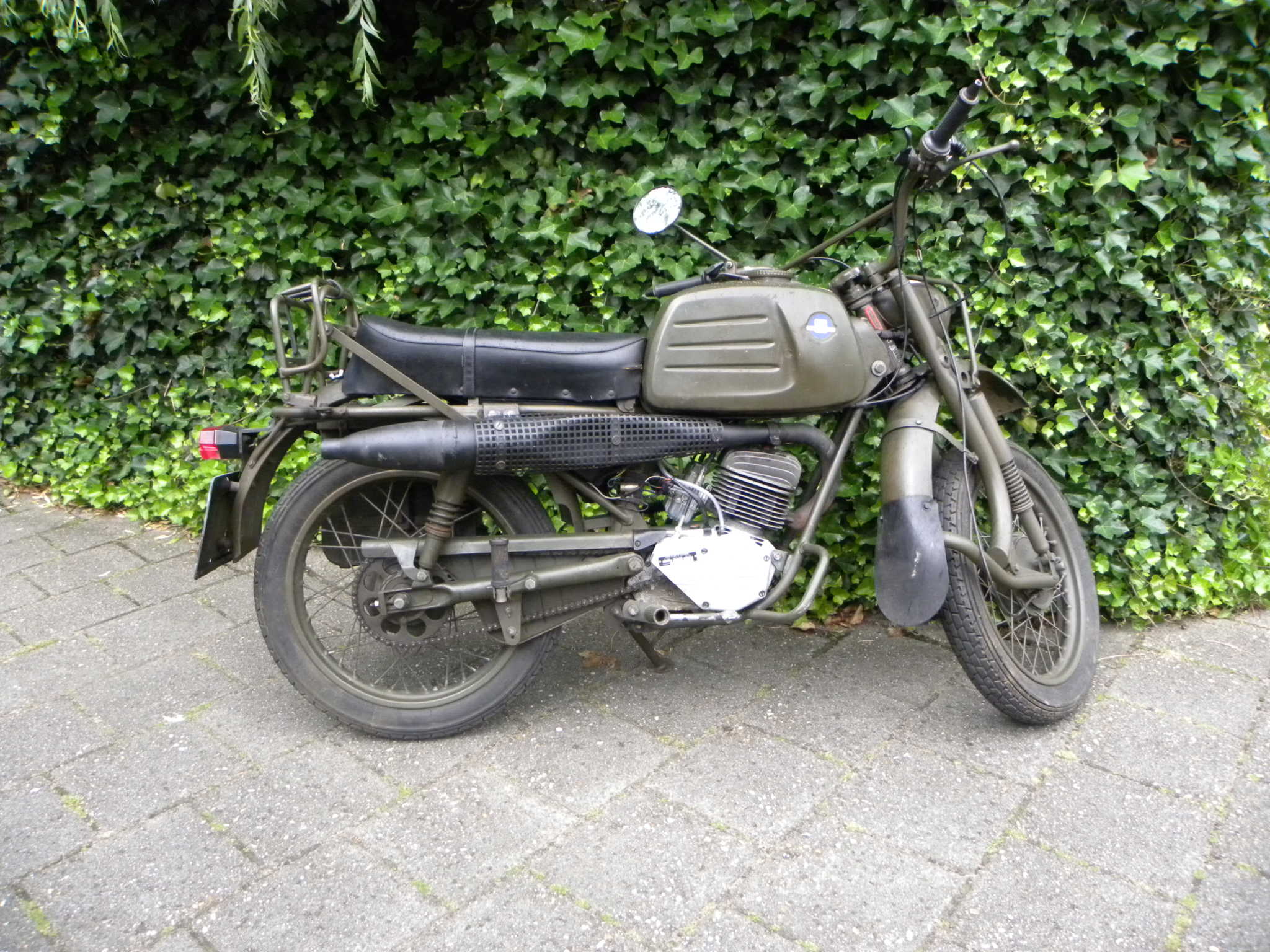 Het fotomodel is een ‘afdakvondst’ die nog even bij de RDW langs moet. Het wakker kussen ging probleemloos. De motor uit 1974 begon zijn leven als NATO-groene T1. In zijn diensttijd werd het technische onderhoud professioneel gedaan. Optisch werd de BW met de kwast mooi gehouden. De motor wordt niet meer 1 op 25 gesmeerd zoals de tankdop adviseert. Met gewone goeie tweetaktolie in een mengverhouding van 1 op 40 heeft deze dapper gillende scharrelaar er gewoon goeie zin in.