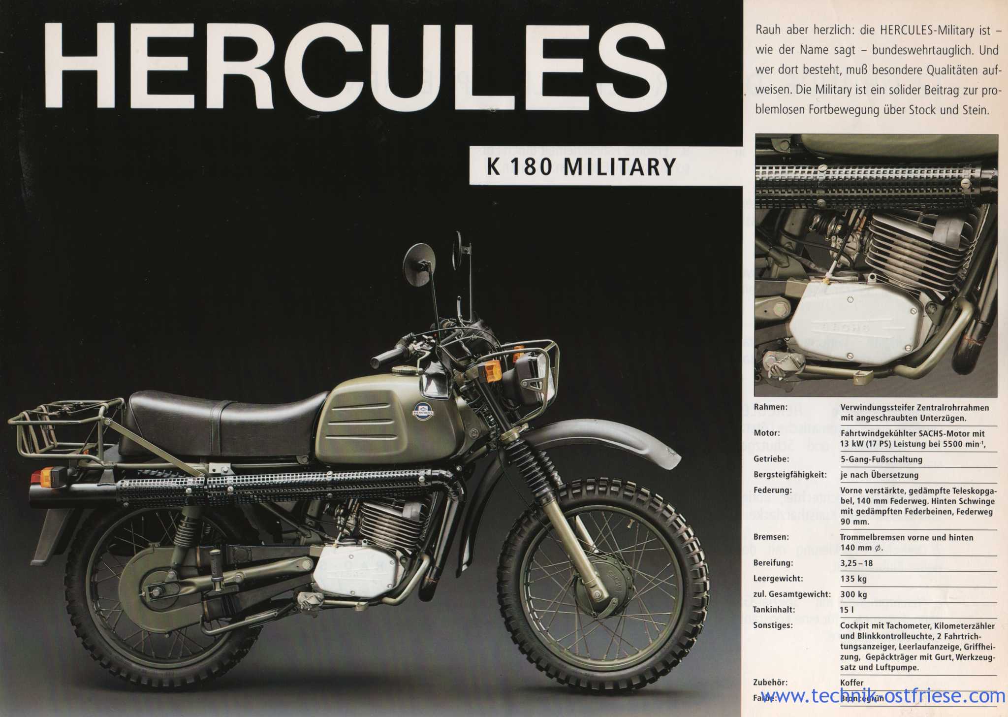 In feite het oudste motormerk ter wereld: Hercules. Hercules had zijn glorietijd onder de vleugels van Sachs. En toen de BundesWehr aan de beurt was voor nieuwe motoren voor hun motor ordonnansen -‘Kradmelder’ heetten ze daar – begon voor Hercules Het Grote Overwerken. De eerste Hercules K 125 BW’s kwamen in 1970 in dienst. En ze zijn nog steeds niet allemaal afgezwaaid!