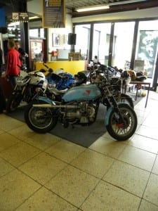 Het was allemaal heel losjes georganiseerd, maar er waren toch een stuk of twintig eigenbouw motorfietsen die deelnamen aan de verkiezinge “De mooiste…”En buiten competitie waren er in en om de vestiging nog een stuk of twintig stukken huisvlijt die van vertederend tot perfect waren.
