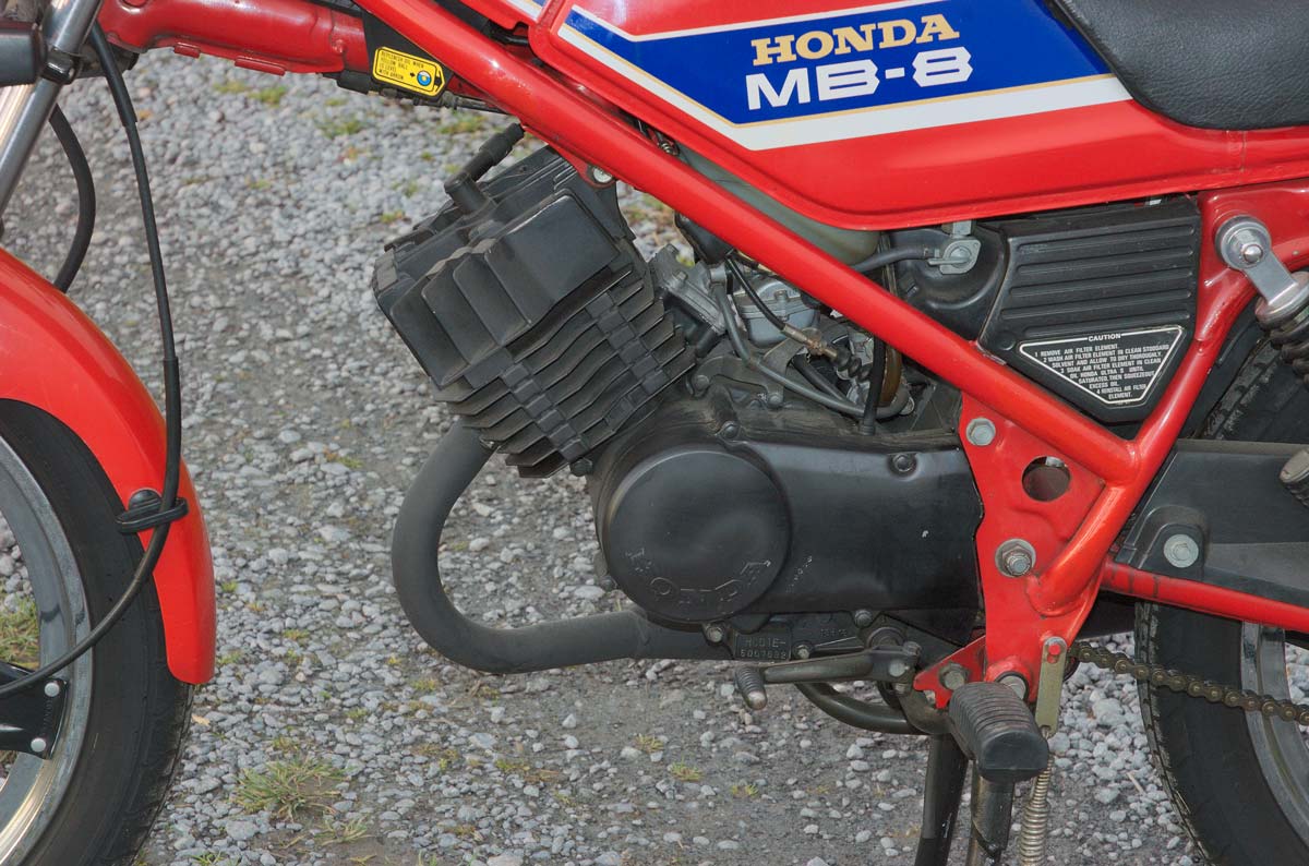 Honda’s overtuiging werd de basis van een legendarische serie viertakt motorfietsen waarbij de CB 750 Four en de zescilinder CBX natuurlijk in ieders geheugen staan gegrift. Honda’s wedstrijdsuccessen hebben ook geschiedenis geschreven. Maar Honda’s reputatie werd toch vooral gezet door de miljoenen en miljoenen lichte (tot 100 cc) viertaktmorfietsjes die wereldwijd de massa mobiel en tevreden maakte. Eerst waren dat gewone kopkleppers met stoterstangen en tuimelaars, later machientjes met bovenliggende nokkenas. De topper aller tijden, dat werd de tot 1984 meer dan 60.000.000 keer verkochte Honda Super Cub, waarbij het letterwoord ?cub? stond voor ?cheap urban bike?. Maar ook vertederende krabbeldieren zoals de Monkey (omdat je er zo uitzag wanneer je er op zat) en Gorilla hadden een eencilinderblokje van 49 cc met bovenliggende nokkenas. Als grootste motorfietsproducent ter wereld kon Honda de potentiële schare tweetaktklanten natuurlijk niet links laten liggen. Bovendien kregen de tweetakten in de jaren tachtig op de circuits de overhand. Daarom bouwde Honda eerst de tweetakt driepitter, de NS 500 en later de legendarische V4, de NSR 500. Dat was ook ongeveer het moment dat de Europese (niet de Nederlandse natuurlijk) markt heel erg veranderde door de nieuwe 80 cc rijbewijsregels in Duitsland. Elke 16-jarige mocht opeens een 80- in plaats van een 50 cc rijden. De Honda MB-8 was een actuele 80 cc motor. Met een 78 cc tweetaktmotor. Parallel aan de MB (de weg uitvoering en de MT, de versie met lichte off-road aspiraties) van 80 cc werden de MB-05 en MT-05 gepresenteerd. De ‘Mokick’ of ‘brommer’ uitvoering van 49 cc. Het mocht dan wel zo zijn dat de viertakt Hondaatjes, stiller, zuiniger en schoner waren, maar echt goedkoop waren ze niet. En daar maakte de MB-8 de klapper. Want die was in 1981 de goedkoopste mogelijkheid om een echte motorfiets te rijden. De nieuwprijs van 2.650 mark was vol in de roos. En zelfs dat zou nog beter worden. Want toen eind 1982 de opvolger van deze dappere dwergen werd gepresteerd, de MBX 80, toen werden MB’s nog tot aan het begin van 1984 in de ramsj verkocht voor krap twee mille aan marken.