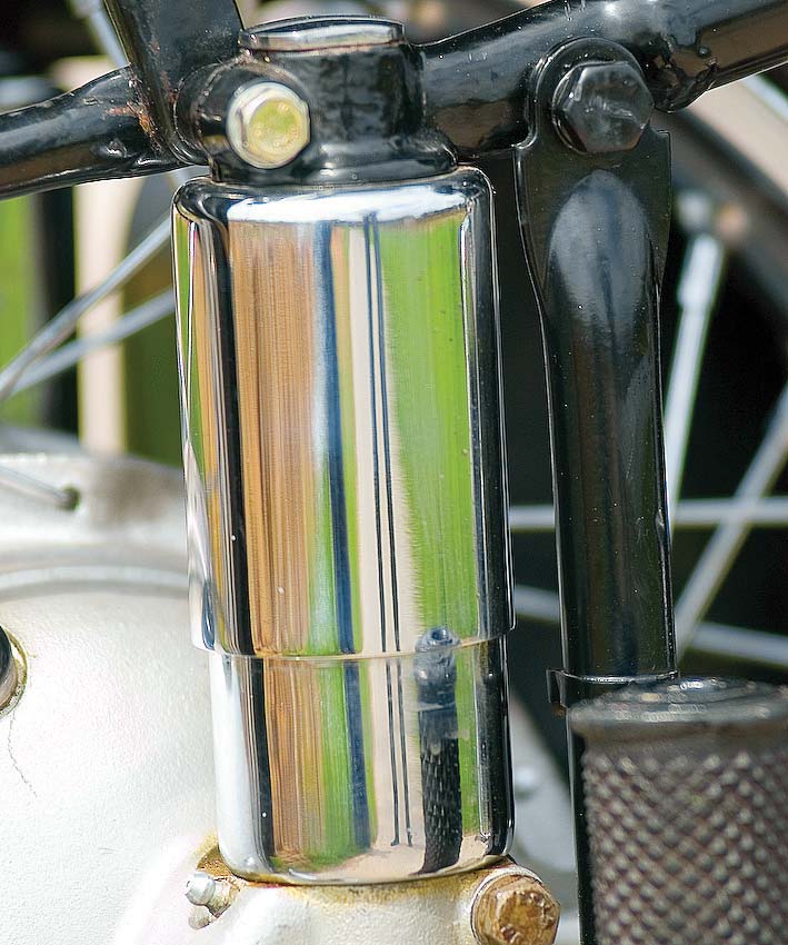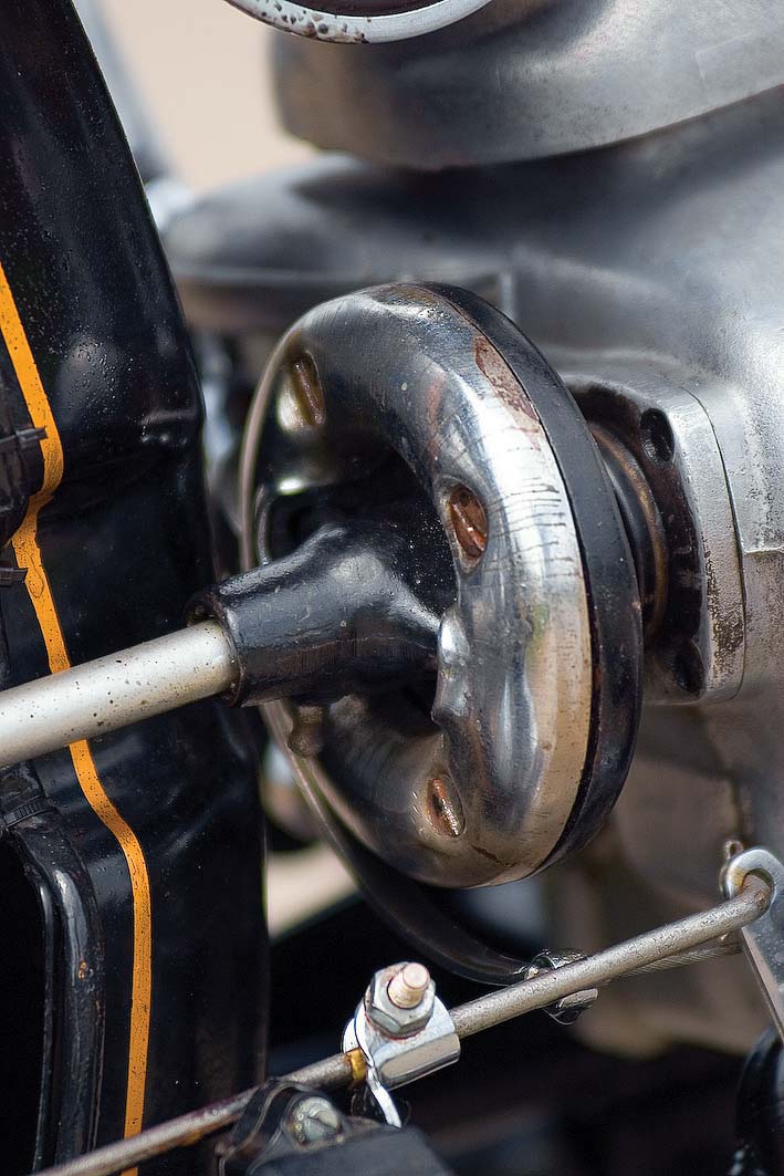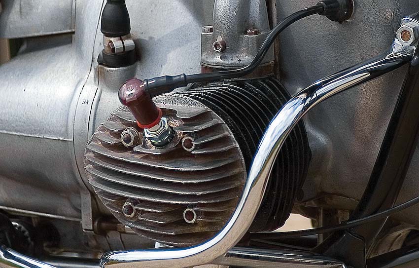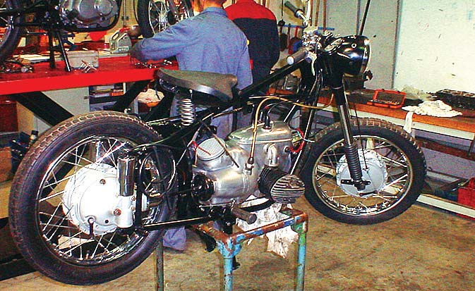 Er kwam opnieuw een kink in de kabel toen ik op het zadel plaatsnam en probeerde het vehikel als een loopfiets te verplaatsen. Een onaangenaam krakend geluid vanuit het cardan wees op onheil. Ik had het hele onderdeel, voor ik het inbouwde, nauwkeurig schoongemaakt en gecontroleerd en niets gezien. Terug naar af, dus. Het bleek een kogellager te zijn. Gelukkig had Torsten Haase het gezochte kogellager op voorraad, in de ‘Oldtimer Scheune’ vond ik bovendien nog een hele cardanoverbrenging, in piekfijne staat. Een vlieggewicht, voor het afregelen van de voorontsteking, veranderde ook van eigenaar en toen kon het definitieve opbouwen beginnen. Het meeste had ik nu compleet, enkel de uitlaten ontbraken nog. Hier was het probleem niet zozeer dat er geen te vinden waren, maar dat er te veel te vinden waren. Van de firma London uit Eemnes, van een Poolse fabrikant en van de firma Trommer. Deze laatste zouden handgemaakte replica´s zijn van de originele. Ze zijn echter zo duur dat ik besloten heb eerst een setje van London te proberen. Deze zien er goed en mooi afgewerkt uit en kosten op Vehikel € 80 per stuk. Bij het nakijken van de cilinders en de zuigers had ik vastgesteld dat een van zuigerveren ontbrak en bij de andere zuiger ontdekte ik een kleine scheur onderaan. Een blik op de website leerde me dat Torsten Haase met een soort van ruilsysteem werkt. Je brengt je oude cilinders en krijgt in ruil (met bijbetaling) gehoonde terug, met nieuwe zuigers en zuigerveren. Een kort telefoontje leerde me dat hij nog één paar had liggen die ik bij ons volgende bezoek aan Chemnitz kon ophalen. Ik had niet op zijn sluitingstijden gelet en stond natuurlijk voor een gesloten deur. Gelukkig nam Torsen het niet zo nauw. Hij verdween om het spul te pakken maar keerde terug met de boodschap dat de koop niet doorging. Hij verklaarde dat mijn cilinders nog nooit gehoond waren. Ik was oprecht verbaasd en teleurgesteld. Het paar wat hij mij in ruil wilde geven was nu op de grootste overmaat. Wat dus betekende dat wanneer ze opnieuw uitgesleten waren ze alleen nog goed waren als schroot. Hij vond deze ruil niet fair! We kwamen overeen dat hij mijn cilinders zou laten honen en voorzien van nieuwe zuigers en voor een paar euro meer het hele boeltje ook nog eens per post opsturen. Waar vind je dit soort mensen nog? Na een paar weken werd het beloofde pakket inderdaad door de postbode afgegeven. Op de avondschool werden de laatste onderdelen gemonteerd, alles voorzien van olie, benzine en de nodige smeermiddelen en zowaar, na enkele trappen op de kickstarter begon de oude dame te hoesten en te rochelen. Na enkele fameus grote blauwe wolken uit de uitlaten kwam ze langzaam tot leven. Weliswaar nog aarzelend en rokend. Ze liep maar er was nog veel werk aan de winkel. De carburateurs werden afgesteld volgens het boekje, maar dit bracht in eerste instantie niet wezenlijk veel verbetering. Pas nadat ik moderne bougies van NGK B6HS monteerde liep de motor tot mijn grote verbazing veel zuiverder, mooi op twee cilinders, met veel minder rook.