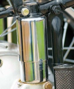Aangezien de motor een exportuitvoering is zaten er ook heel wat verchroomde delen aan. Het oorspronkelijke chroom was in heel slechte staat, dus alles ging naar Eurochroom in Brussel, waar alles voor een schappelijke prijs als nieuw werd. De te lakken delen werden inmiddels – indien nodig – opgeknapt en daarna gepoedercoat. Het nadeel van poedercoaten is dat je nadien een soort van sinaasappelhuid hebt. Vrouwen zijn hier niet gelukkig mee, maar ook op een motorfiets is het niet echt een mooi gezicht. Na het poedercoaten werd dus alles behandeld met spuitplamuur en meters schuurpapier, om vervolgens in de ‘spuitcabine’ van Marc, prachtig diepzwart gespoten te worden. Intussen was ik in contact gekomen met Torsten Haase uit Neukirchen, bij Chemnitz, een handelaar die niet alleen vrijwel alles van DDR motoren weet, maar ook heel veel onderdelen op voorraad heeft, zowel nieuw als tweedehands en replica. Bij mijn eerste bezoek aan hem vond ik een schat aan onderdelen. Originele ‘spitse’ rem- en koppelingshendels waren volgens hem onvindbaar en bijzonder felbegeerd. Thuisgekomen kon voorzichtig begonnen worden de eerste stukken te monteren. De naven werden na heel veel poetswerk schoon maar het bleek dat het aluminium na enkele weken alweer donker werd. Eenmaal gespaakt zou het heel moeilijk zijn de naven nog te reinigen, daarom werd besloten de naven met aluminiumkleurige lak te spuiten. Tot nu toe zien ze er nog altijd goed uit, dus dat is een goede keuze gebleken. Het gedeelte spaken is een vak apart, maar mijn (toen) 12-jarige zoon bleek een genie te zijn. Hij slaagde erin alle spaken op 15 minuten tijd op de juiste manier aan naaf en velg te monteren. Emiel van der Snickt, een plaatselijke fietsenmaker van de oude stijl, zorgde er daarna voor dat wielen mooi op spanning stonden en de velgen perfect ten opzichte van de naven. Zulke oude fietsenmakers zijn geld waard. Emiel had vroeger nog Suzuki motorfietsen verkocht en vond het helemaal prachtig.