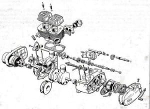 Moderner dan die warm rood gespoten en van allerlei beplating voorziene top JAWA’s uit de midden- en eind vijftiger jaren. Modellen die als ‘Senior’ overigens nog tot ergens in de zeventiger jaren leverbaar waren. Het model 638 werd gepresenteerd in de zomer van 1984. Het was natuurlijk afgeleid van het voorgaande model, de 634. De o zo praktische kettingkast bleef behouden. Het motorblok was helemaal nieuw ontwikkeld. Het bleef wel een luchtgekoelde 2 takt 344,5 c (58 x 65) 2 cilinder, met nu 26 pk vermogen bij 5250 t.p.m. De lichtmetalen cilinder had een ingeperste gietijzeren voering. Het blok is 7 kg lichter dan zijn voorganger. De 4 versnellingsbak heeft een half automatische koppeling, bediend door de versnellingspook.