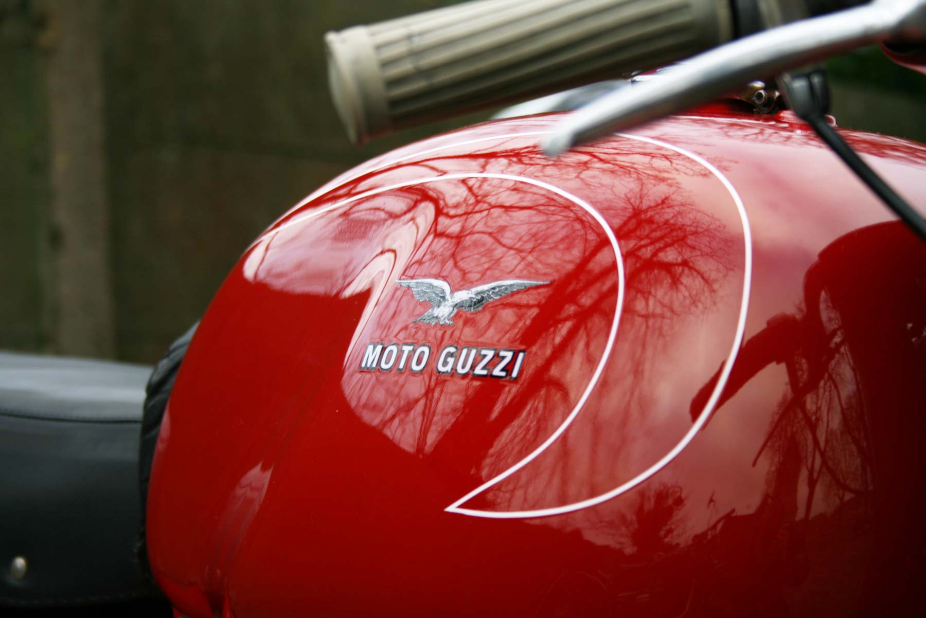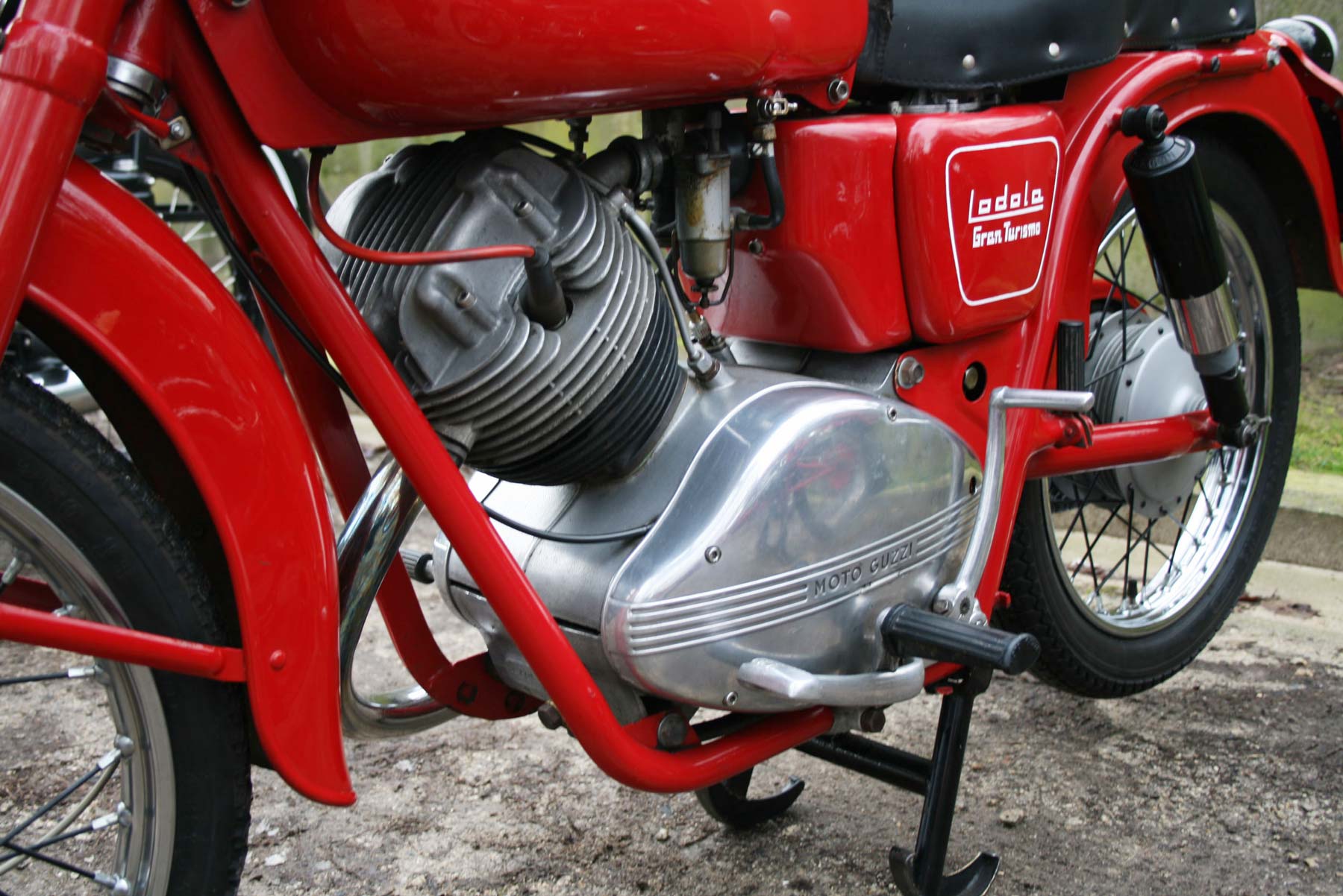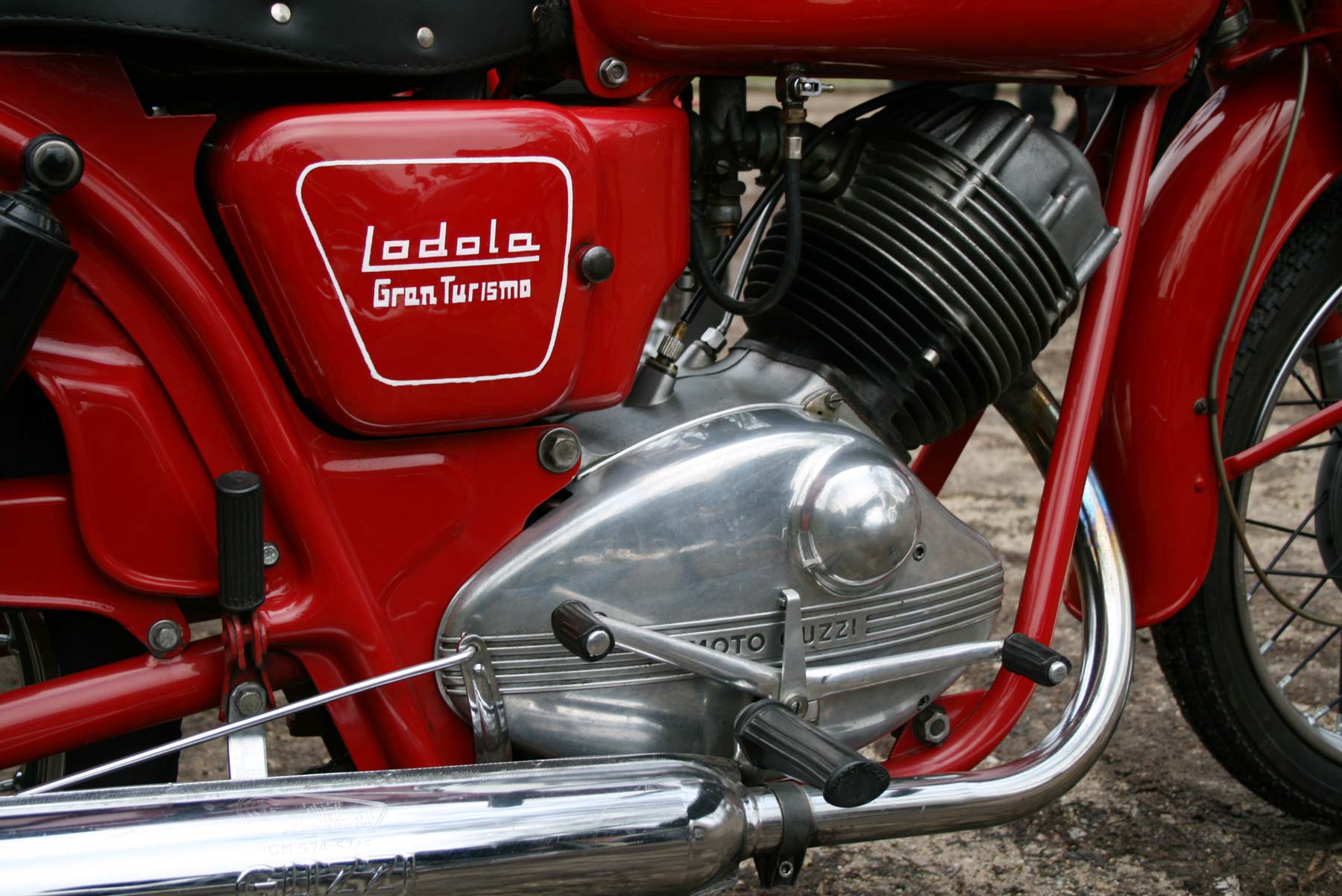 Halverwege de jaren ’50 verkeerde Italië in een crisis, de motorfietsmarkt had het zwaar te verduren. In tegenstelling tot landen als Duitsland en Groot-Brittannië waar nog wat geld te verdienen was aan de motorfietsexport, was dit in Italië niet het geval. Dus probeerde men bij Moto Guzzi de binnenlandse vraag te vergroten. Maar hoe doe je dat als ook nog eens een kleine auto (Fiat dus) roet in het eten komt gooien? Guzzi ging zich toeleggen op de lichte viertakten: betaalbaar, sportief en technisch hoogstaand, en dat men in de Motogiro d’Italia (een straatwedstrijd voor productiemachines) enkel aan de start mag verschijnen met een cilinderinhoud lager dan 175cc was natuurlijk geen toeval. Carlo Guzzi ging aan de slag voor, wat later zou blijken, z’n laatste ontwerp: de Lodola. Voor ons misschien een wat vreemde benaming maar voor de Italianen is dit een ‘leeuwerik’ en past perfect in het rijtje van benamingen als Falcone (jachtvalk) en Cicogna (ooievaar).