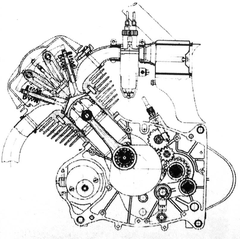 De vierversnellingsbak zat ingebouwd en van daaruit werd ook de snelheidsmeter aangedreven. Aan de linkerkant van het blok zat nog steeds het karakteristieke grote vliegwiel, alleen nu goed weggestopt achter een zijdeksel. Daar zat ook een V-riem voor de aandrijving van de dynamo.