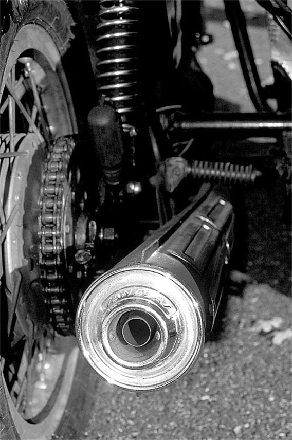 Op de forse uitlaatdemper staat de merknaam Sanglas vermeld