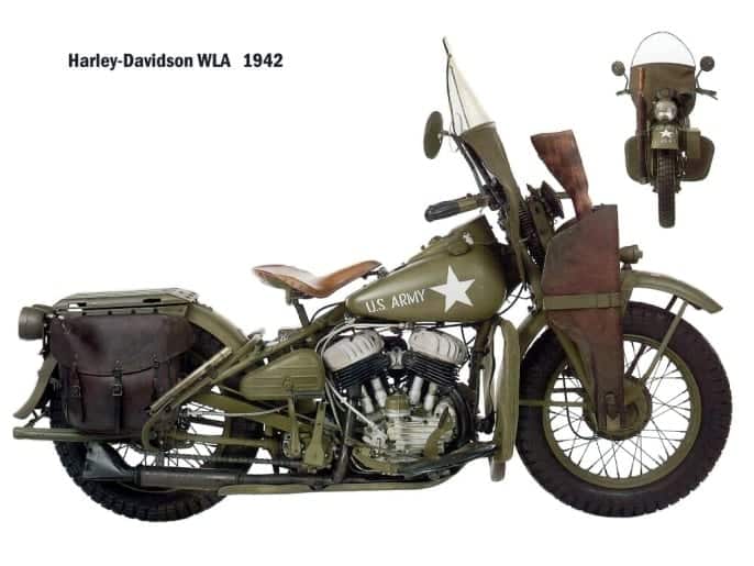 En dan is het aardig om te weten dat de legerstrategen de gemiddelde totale levensduur van zo´n Harley-Davidson WLA onder oorlogsomstandigheden hadden berekend op… 30 dagen. Het leger vroeg offerte aan in 1937 en kreeg de eerste 2 prototypes in 1939. Tussen januari en maart 1940 bestelde het leger de eerste 400 WLA´s waarvan de carters ´WLA´ ingeslagen hadden. Daarmee kreeg concurrent Indian de genadeslag.