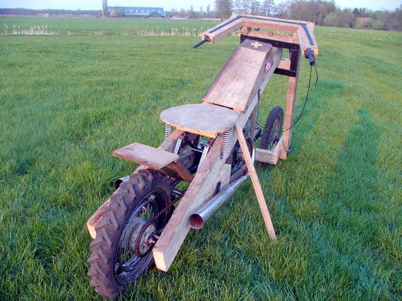 Het wachten is nog even op de hybride Jawa, maar vooralsnog moeten we het doen met de Jawa 23 PK die in de achterhoek werd ontwikkeld. Via een milieu allervriendelijkst proces, werd bij de Haan Motoren deze botte bike vervaardigd. Het regenwoud werd daarbij gespaard en er werden dan ook alleen maar Friese bomen gebruikt die toevallig in de vorm van acht meter steigerbalk, vijf meter krathout en een geheel gedroogde plaat triplex voorhanden waren.