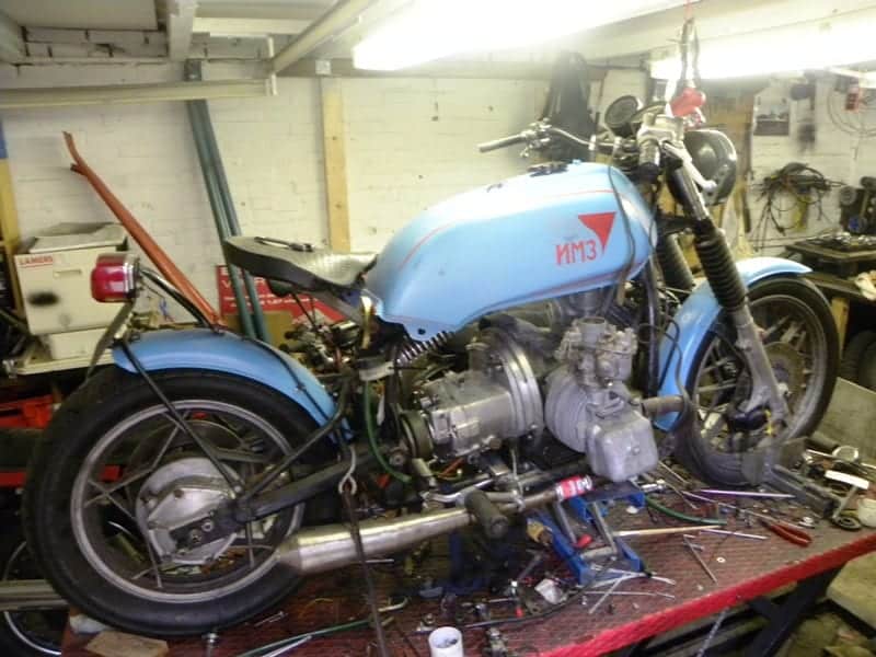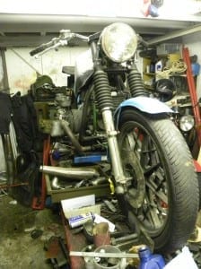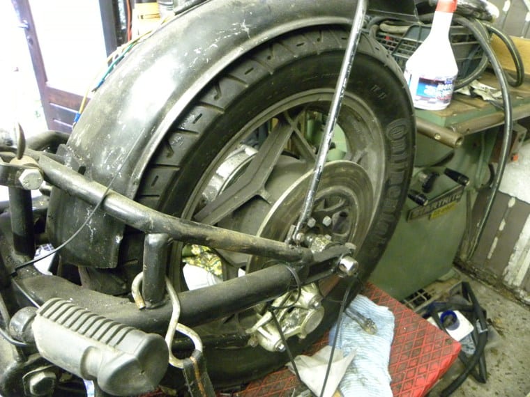 Het frame is gemaakt (verbreed) met de stukken van een ander frame. Oud model BMW voorvorkpoten passen in de Russische balhoofdsplaten (bijna). Het vette Honda (?) achterwiel kreeg een nieuw hart om Dnepr compatibel te zijn. De tank is van een CB 900, de achtervork is type ‘bakken & braden’. Het blok is een DAF44 motor met een stel VW Kever carburateurs…