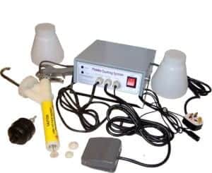 Aan de compressor worden niet al te hoge eisen gesteld. 17 psi of net iets meer dan 1 bar is genoeg druk om een wolk positief geladen poeder in de richting van het onderdeel te blazen en een tank van 25 liter voldoet ook al prima. Met andere woorden, de typische huis en tuin compressor van de bouwmarkt en je bent op weg.